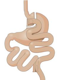 | The stomach size will be reduced through creating a small pocket not larger in size than 10%-15% of the original stomach size, and will be separated from the other part of the stomach by using specialized surgical staplers. Then this pocket is connected to the small intestines after overtaking 100-150 cm of the small intestines. | ![]() |